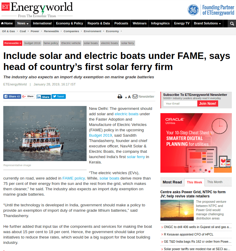 New Delhi: The government should add solar and electric boats under the Faster Adoption and Manufacture of Electric Vehicles (FAME) policy in the upcoming Budget 2019, said Sandith Thandasherry, founder and chief executive officer, Navalt Solar & Electric Boats, the company that launched India’s first solar ferry in Kerala.