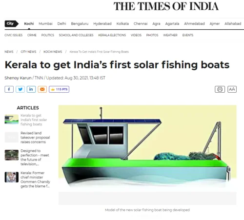 India’s first sea-going solar fishing boat will be ready by Dec 2021 at Vypeen and Munambam in Kerala